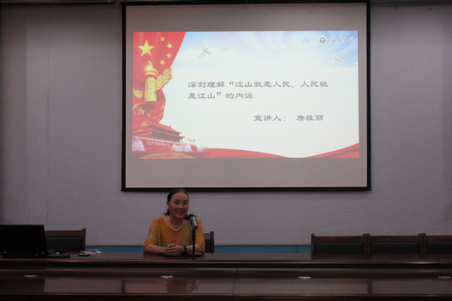 唐桂丽教授紧紧围绕习近平总书记“七一”重要讲话精神,以“人民”为主题,对“江山就是人民,人民就是江山”进行了深刻阐述,系统回顾了中国共产党百年来,与人民群众的血肉联系,准确解读坚持以人民为中心的根本立场是学习贯彻习近平新时代中国特色社会主义思想的基点。唐教授说:习近平总书记讲“淮海战役胜利是靠老百姓用小车推出来的,渡江战役胜利是靠老百姓用小船划出来的;社会主义革命和建设的成就是人民群众干出来的;改革开放的历史伟剧是亿万人民群众主演的。”“人民对美好生活的向往,就是我们的奋斗目标。”这些话从现实维度揭示了“江山就是人民”的深刻意蕴,反映了中国人民对美好生活的向往和中国共产党执政为民的使命担当。
