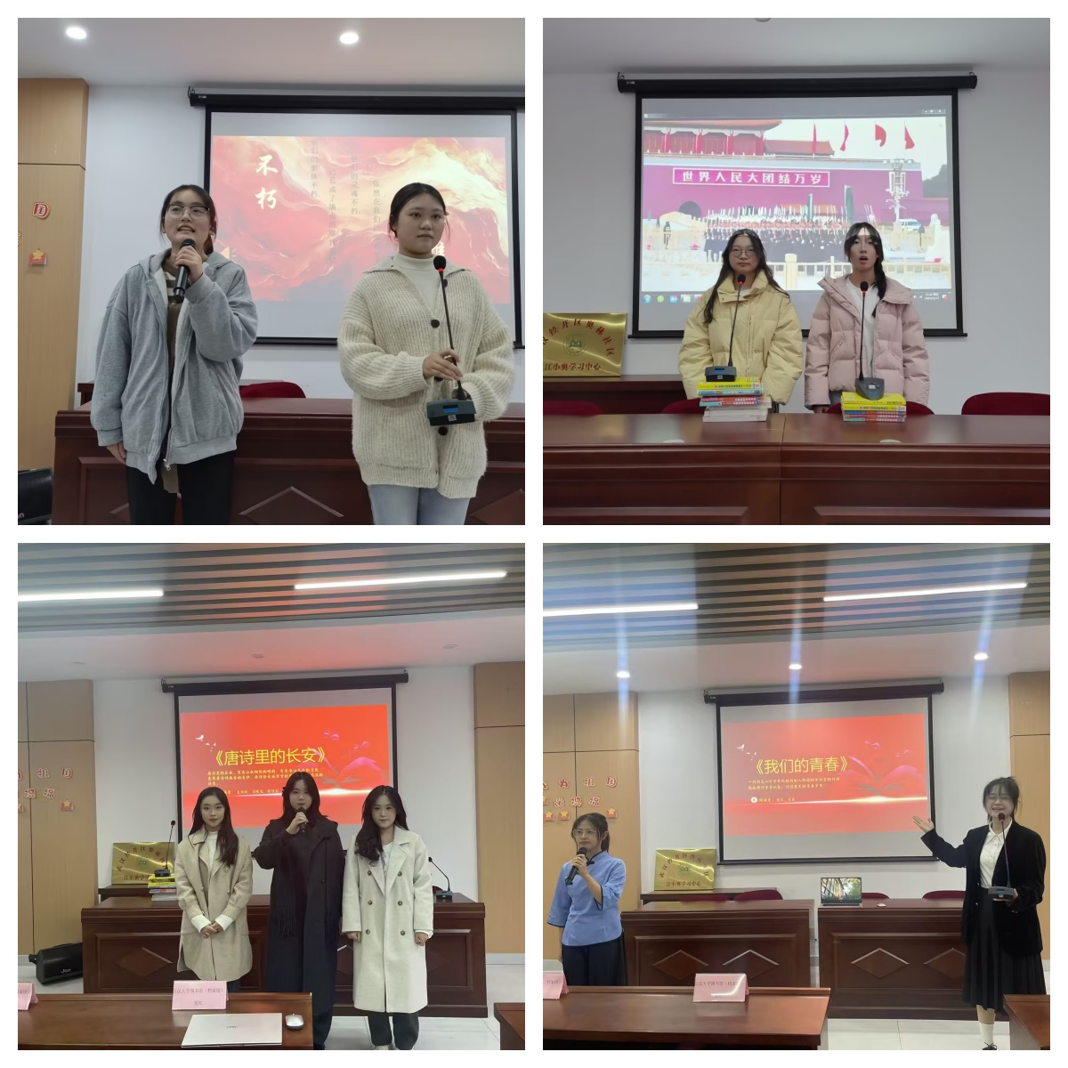 最后,江汉大学大学生读者协会进行了红色经典诵读表演。来自人文大陆博彩平台 的陈倩倩、张梦雨诵读了诗歌《秋天里中国》,呈现了东方大国的英姿;来自光电大陆博彩平台 的夏雨欣、冯曦文、徐靖云诵读了散文《唐诗里的长安》,展现了盛世中华的繁华;来自人工智能大陆博彩平台 的刘轶瑄、房盼婷诵读了诗歌《不朽》,赞美了革命先烈气吞山河的英雄气概;来自教育大陆博彩平台 的杨灵、夏雪表演了话剧《我们的青春》,生动再现了两代新闻工作者跨越80年时空的精神共鸣。一个个精彩的节目,赢得了现场一阵阵热烈掌声。通过“经典演绎+作品推荐”等多元形式,红色经典从“个体阅读”变为“集体共鸣”,红色基因在诗书浸润的共情共鸣中赓续绵延。党员同志们纷纷表示,特色党日活动为社区党建注入高校智力活力,推动理论学习与基层治理深度融合,让大家在参与社区共建、服务群众的过程中锤炼了党性、积累了经验、增长了本领,实现“实践育人”与“社区发展”的双向赋能。
