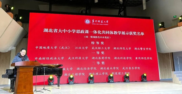 2024年1月3日,湖北省大中小学思政课一体化共同体优秀作品表彰大会在华中师范大学音乐厅举行。江汉大学牵头打造的一体化展示课程《“典”亮生活 法治伴我同行》在湖北省大中小学思政课一体化共同体教学展示活动中,被评为特等奖。