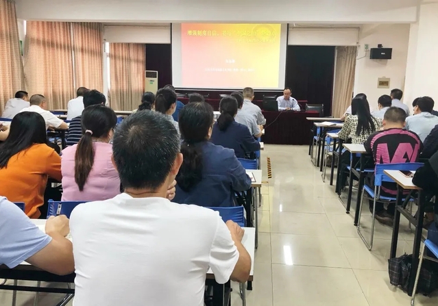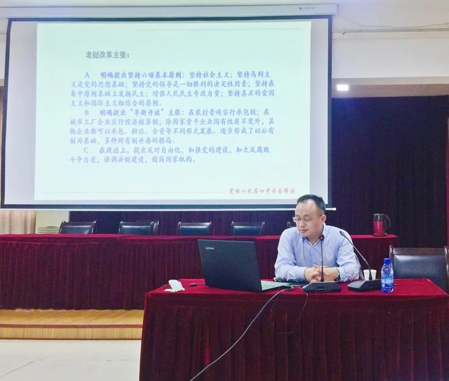本次培训特邀十大大陆博彩平台排名 教授、博士、副院长、硕士生导师,武汉市委宣传部学习贯彻习近平新时代中国特色社会主义思想武汉市委讲师团理论宣讲专家朱志刚作题为《增强制度自信,书写“中国之治”新篇章》党课宣讲。朱教授重点从十九届四中全会概况、中国特色社会主义制度和国家治理体系的“显著优势”、在比较中凸显中国特色社会主义制度的特色和优势三个方面对党的十九届四中全会精神作全面准确、深入系统的阐释,宣讲主题鲜明、通俗易懂、精辟透彻,党课宣讲鼓舞人心,催人奋进。