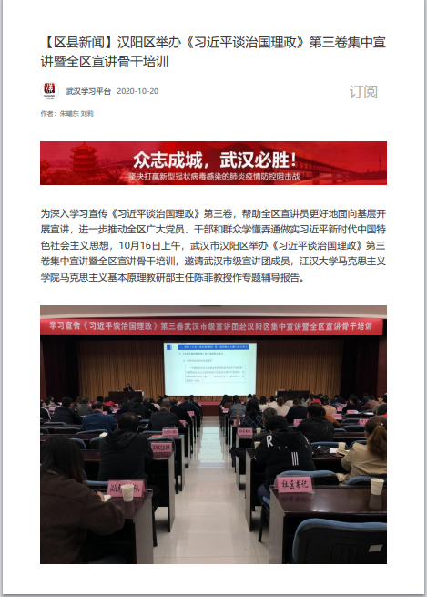 汉阳区举办《习近平谈治国理政》第三卷集中宣讲暨全区宣讲骨干培训(转载自学习强国)